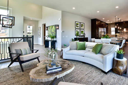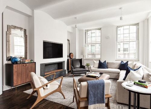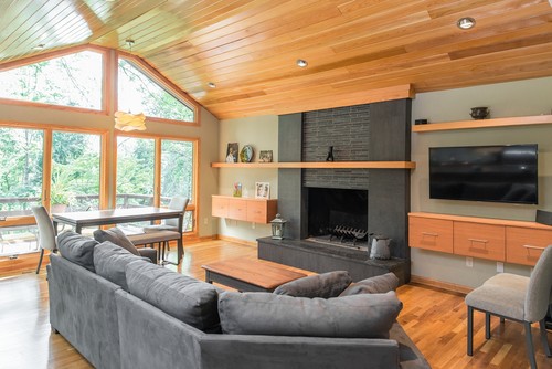 In this image, the table in the background represents a very structural design. The floating cabinets on either side of the fireplace represent a balance principle of design. The shelves above the cabinets utilize a line element of design. The usage of dark gray and light colored wood in the space crates rythym by contrast.