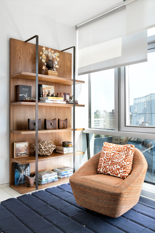 The texture of the carpet and that of the chair contrast nicely, utilizing a texture element of design. The proportions between the shelving and the shorter chair is an example of proportion.